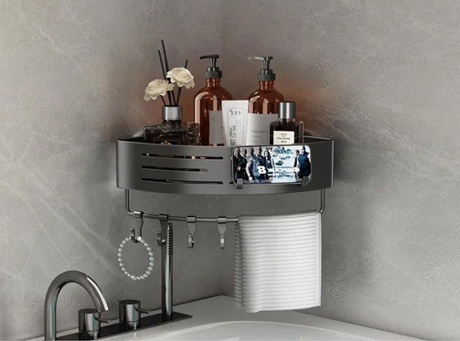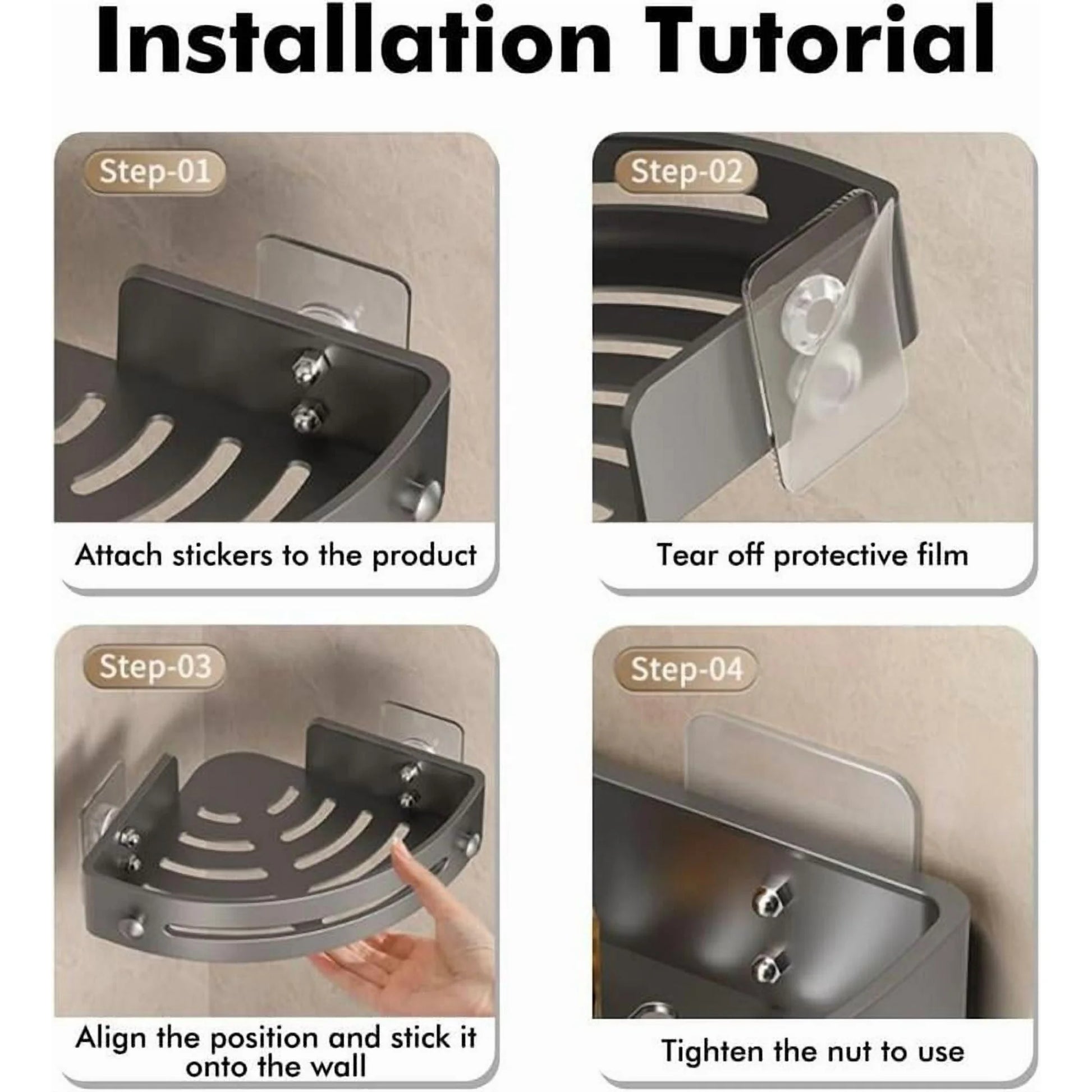 No drilling is required. The caddy uses heavy-duty adhesive stickers that hold strong without damaging your walls.